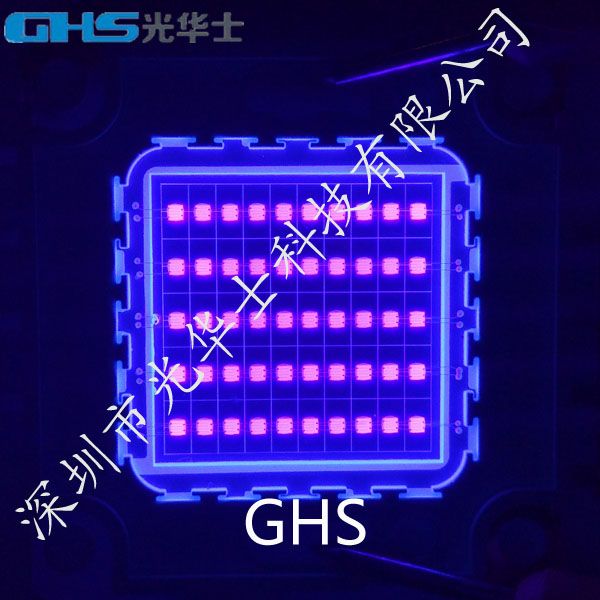 基本参数如下:产品名称:50W大功率紫光led灯珠产品品牌:光华士芯片波长:365nm/375nm/385nm/395nm/405nm/415nm芯片品牌:进口芯片串并联数:10并5串使用电压:30.0-36V使用电流:1500mA